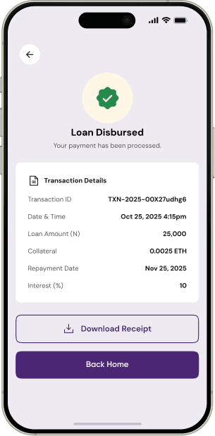 Get the Naira liquidity you need, secured by your crypto collateral (BTC, ETH, USDT), deposited straight to your bank account. Repay and your crypto is returned.